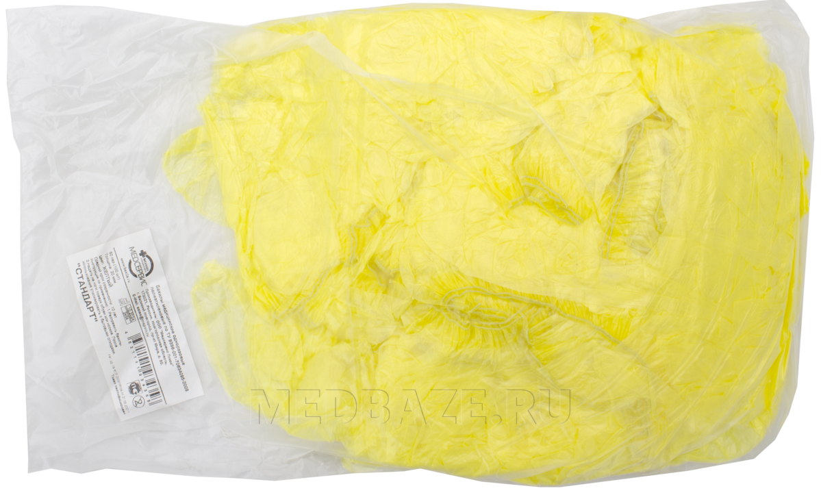 Описание: Бахилы Стандарт, одноразовые, изготовлены из полиэтиленовой пленки желтого цвета, плотностью 20 мкм. Бахилы упакованы блоками по 50 пар, вес одной пары 2.8 г.