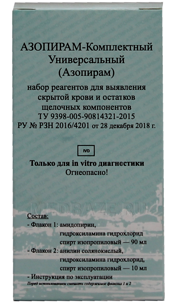 Флакон №1: Стабилизированный раствор Амидопирин - 10 г Гидроксиламина гидрохлорид - 0.05 г Спирт изопропиловый - 90 мл.Флакон №2: Стабилизированный раствор Анилин солянокислый - 0.15 г Гидроксиламина гидрохлорид - 0.05 г Спирт изопропиловый - 10 мл.