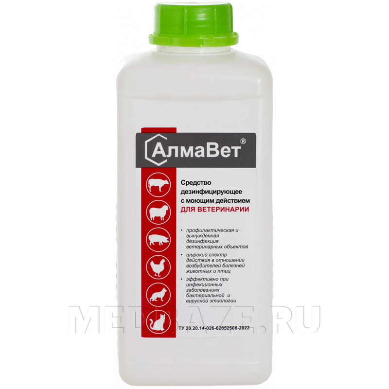 Описание: Дезинфицирующее средство с моющим эффектом АлмаВет обладает широким спектром действия в отношении возбудителей различных болезней животных и птиц. Эффективно при инфекционных заболеваниях бактериальной ивирусной этиологии.