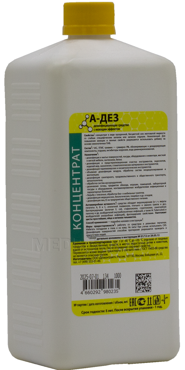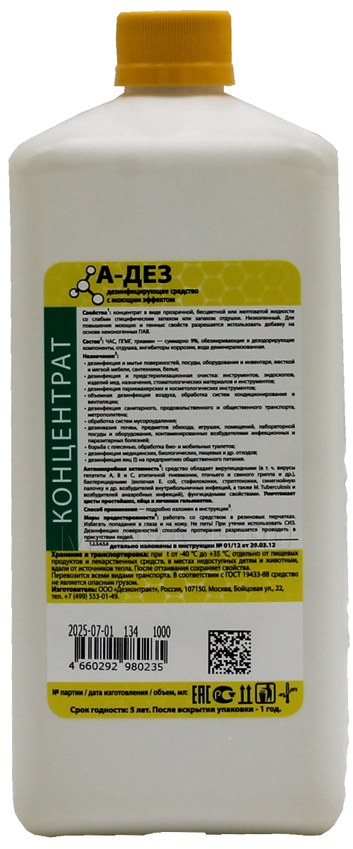 Описание: Дезинфицирующее средство А-Дез Концентрат в виде бесцветной или желтоватого оттенка прозрачной жидкости со слабым специфическим запахом или запахом применяемой отдушки. Не содержит токсичных компонентов, таких как хлор, альдегиды, фенолы. Полностью разлагаемое, безопасно для человека и окружающей среды.