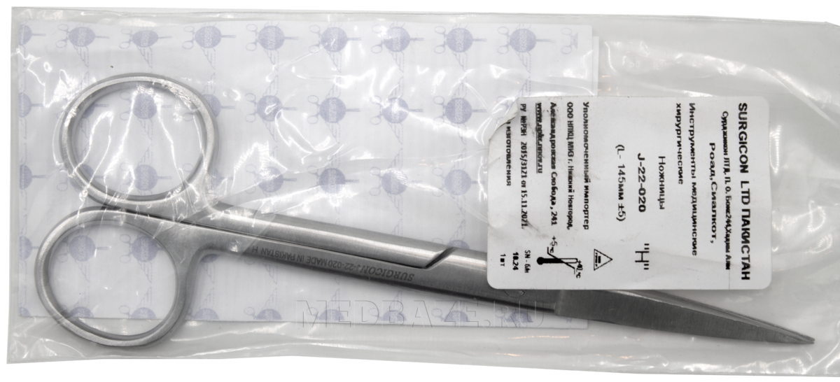 Описание: Ножницы остроконечные прямые хирургические длиной 145 мм. Длина рабочей части 45.5 мм, высота изгиба 5.3 мм.