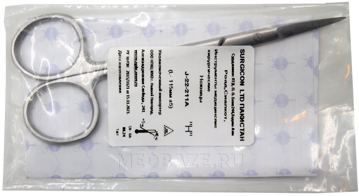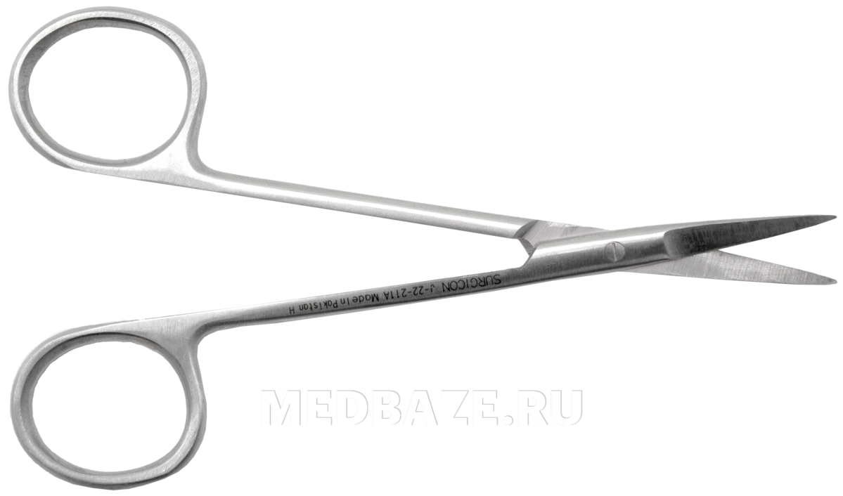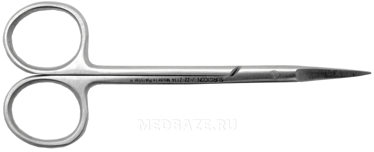 Описание: Ножницы глазные остроконечные прямые длиной 115 мм. Длина рабочей части 22.6 мм.