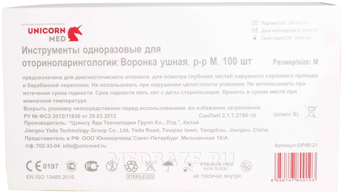 Описание: Изделие медицинское, воронка ушная одноразовая стерильная для осмотра глубоких частей наружного слухового прохода и барабанной перепонки. Изготавливается из черного теплопроводного медицинского полипропилена. Воронка ушная атравматична - имеет гладкие ровные поверхности и края, которые исключает риск повреждения тканей. Бывают З-х типоразмеров (диаметр узкой части): S - 2,7 мм, M - 4 мм, L - 4,6 мм. Высота воронки: 35±2 мм, диаметр широкой части: 28±2 мм. Ушная воронка упакована в герметичный пакет, снабженный насечкой, обеспечивающей быстрое вскрытие без использования ножниц. Стерилизована оксидом этилена.