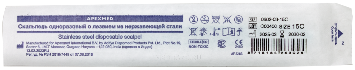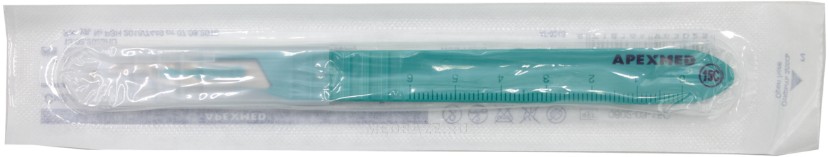 Описание: Изделие медицинское стерильное одноразовое Скальпель Apexmed размер 15C из высококачественной закаленной нержавеющей стали, с ручкой из полистирола. С лазерным контролем заточки и полировкой режущего края лезвия. Длина шкалы ручки 6 см с ценой деления 1 мм. Лезвие закрывается защитным колпачком.