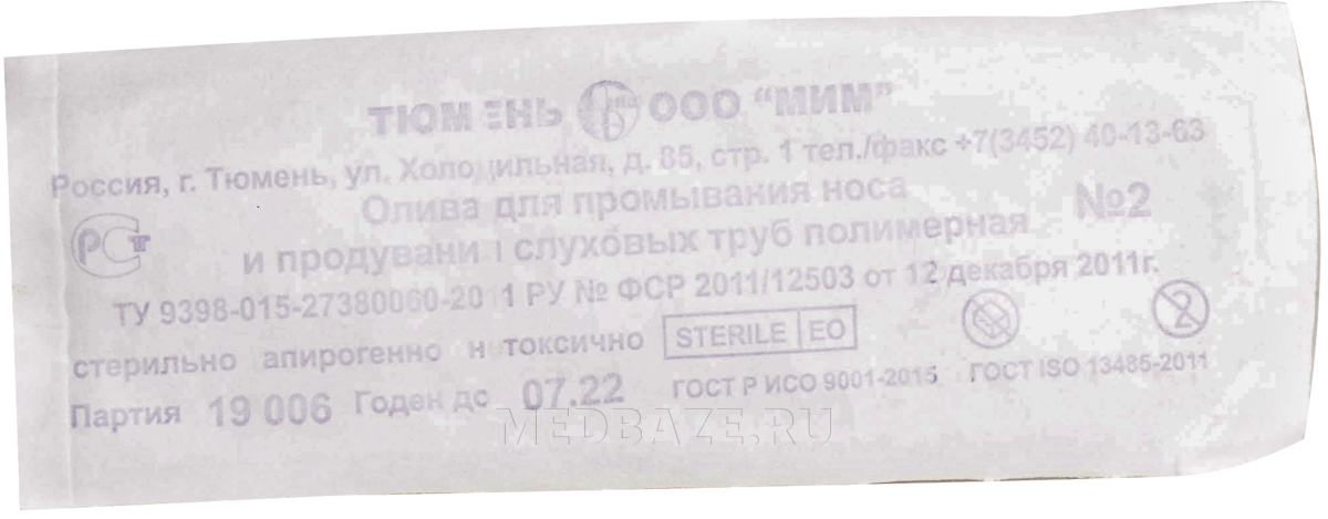 Описание: Изделие медицинское стерильное одноразовое Олива для промывания носа и слуховых труб № 2 (взрослая), представляет собой наконечник, имеющий с одной стороны утолщение (для плотного прилегания к ноздре пациента), с другой стороны штуцер (для подающего шланга). Внутри предусмотрен канал, по которому в полость носа из кружки «Эсмарха» или других устройств подается лекарственный раствор или другие препараты. Применяется для терапии и профилактики гайморита, аденоидита, ринита.