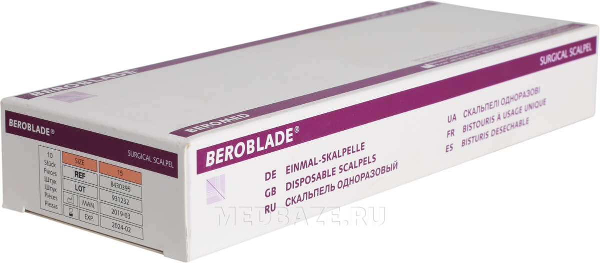 Описание: Хирургический скальпель, стерильный, лезвие изготовлено из высокоуглеродистой стали, ручка из пластика. Стерилизован гамма-излучением. Соответствует всем требованиям эргономики. В процессе использования скальпель является непосредственным продолжением руки хирурга и обеспечивает точную реализацию запланированного разреза. Лезвие скальпеля снабжено защитным пластиковым колпачком. Форма лезвий соответствует международному стандарту (размеры № 10, 11, 12, 13, 14, 15, 16, 18, 19, 20, 21, 22, 23, 24, 27, 36).