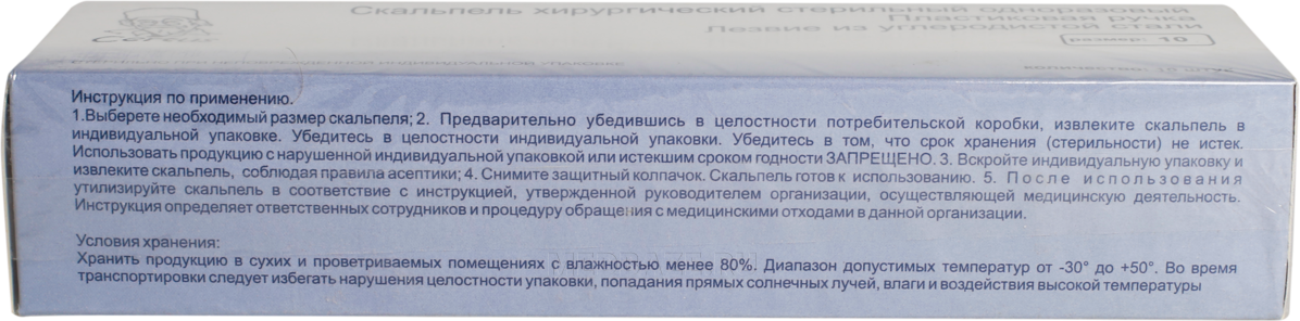 Описание: Хирургический скальпель, стерильный, лезвие изготовлено из углеродистой стали, ручка из пластика. Стерилизован гамма-излучением. Соответствует всем требованиям эргономики. В процессе использования скальпель является непосредственным продолжением руки хирурга и обеспечивает точную реализацию запланированного разреза. Лезвие скальпеля снабжено защитным пластиковым колпачком. Форма лезвий соответствует международному стандарту (размеры № 10, 11, 12, 13, 14, 15, 16, 18, 19, 20, 21, 22, 23, 24, 27, 36).