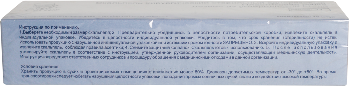 Описание: Хирургический скальпель, стерильный, лезвие изготовлено из углеродистой стали, ручка из пластика. Стерилизован гамма-излучением. Соответствует всем требованиям эргономики. В процессе использования скальпель является непосредственным продолжением руки хирурга и обеспечивает точную реализацию запланированного разреза. Лезвие скальпеля снабжено защитным пластиковым колпачком. Форма лезвий соответствует международному стандарту (размеры № 10, 11, 12, 13, 14, 15, 16, 18, 19, 20, 21, 22, 23, 24, 27, 36).