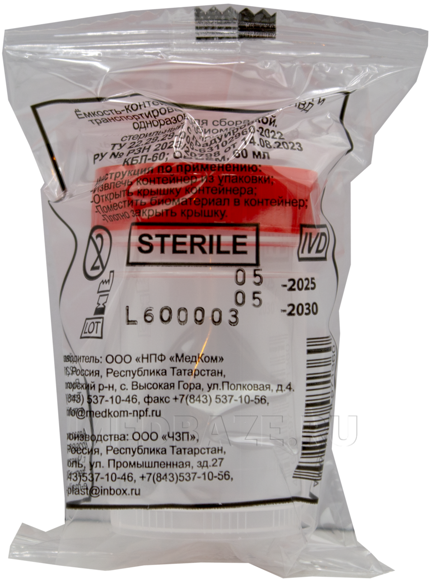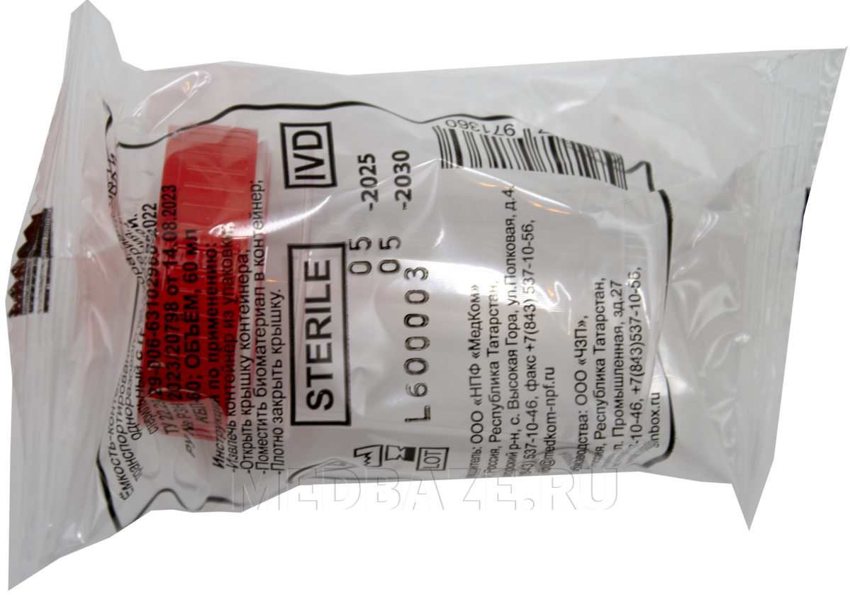 Описание: Контейнер одноразовый для сбора и транспортировки биоматериала. Изделие стерильное в индивидуальной упаковке. Контейнер снабжен герметично завинчивающейся крышкой, предотвращающей попадание в пробу микроорганизмов из атмосферного воздуха, появление запаха и обеспечивающей защиту от протекания. Емкости изготовлены из прочного пластика и выдерживают низкие температуры.
