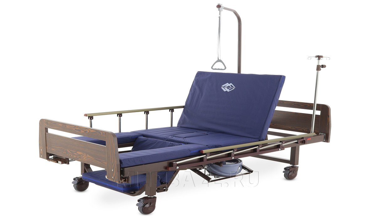 Комплектация: матрас арт. 16 (199*90*6 см), 2 механических привода, рукоять вращения для туалетного устройства - 1шт., инфузионная стойка, дуга для подтягивания, ванночка для мытья головы, накроватный столик, туалетное судно (ведро с крышкой), уголки для удлинения ложа (+11.5 см) - 4шт., крючки для мочеприемников - 4шт.