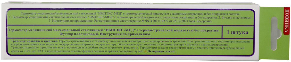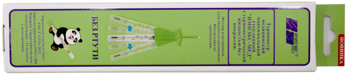 Описание: Термометр медицинский без ртути в прозрачном футляре с диапазоном измерений температуры от 35°С до 42°С. Колпачок футляра имеет резьбовое соединение и устройство для стряхивания в виде двух лепестков и гибкой нескользящей ручки. В качестве термометрической жидкости исползуется галинстан. Способы измерения - подмышечный, оральный, ректальный.