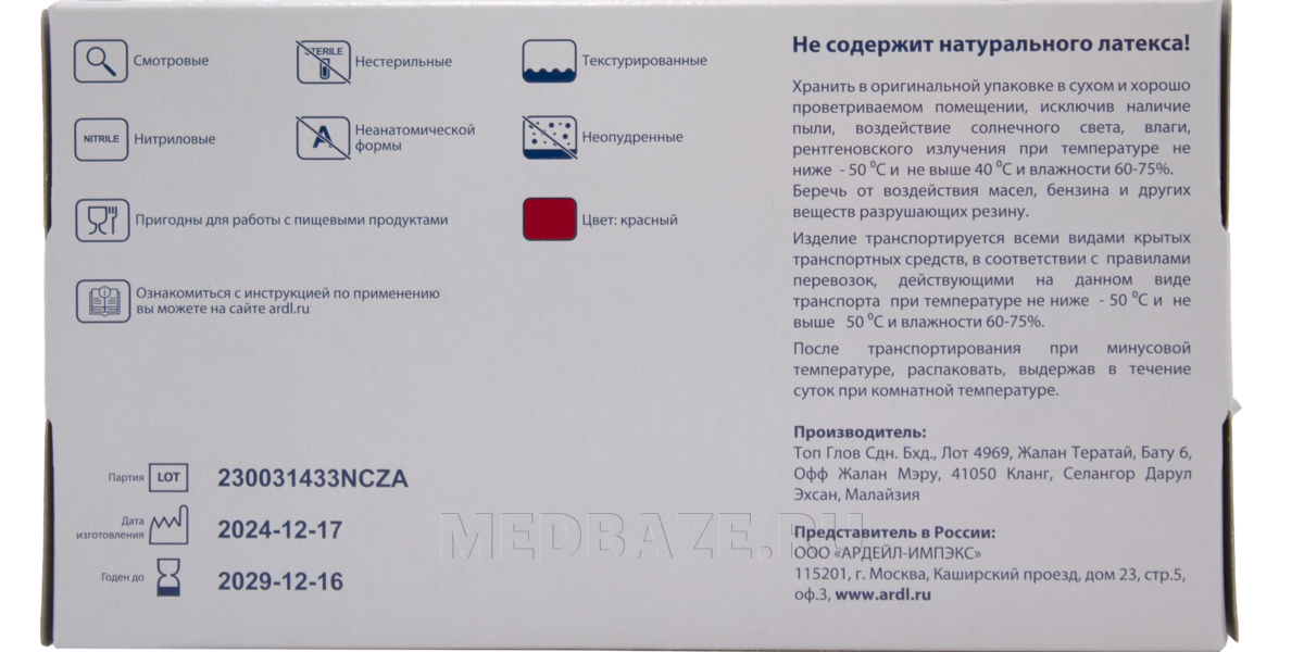 Описание: Перчатки смотровые нитриловые, нестерильные, без разделения на правую и левую руку. Текстурированная рабочая поверхность обеспечивает особо надежный захват инструмента в руке. Перчатки не лишены тактильной чувствительности, не меняют своих свойств в сухой и влажной среде, изготавливаются из синтетического материала без добавления латекса и пудры. Данное решение исключило возможность развития аллергических реакций. Предназначены для: защиты рук при проведении медицинских, диагностических, производственных, лабораторных процедур.