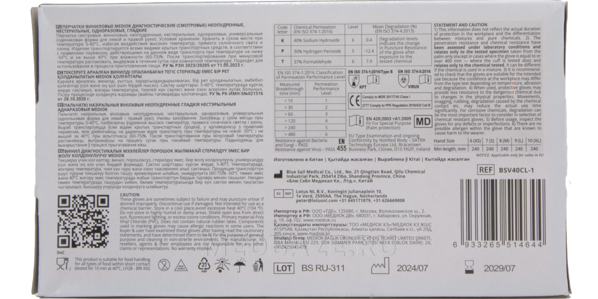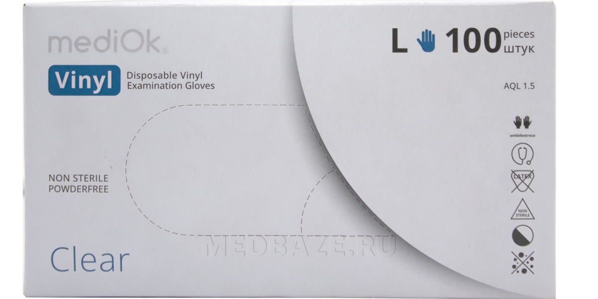 Описание: Перчатки виниловые, нестерильные, неопудренные, без разделения на правую и левую руку. Виниловые перчатки не вызывают аллергических реакций, устойчивы к воздействию спиртав, минеральных масел и дезинфектантов.