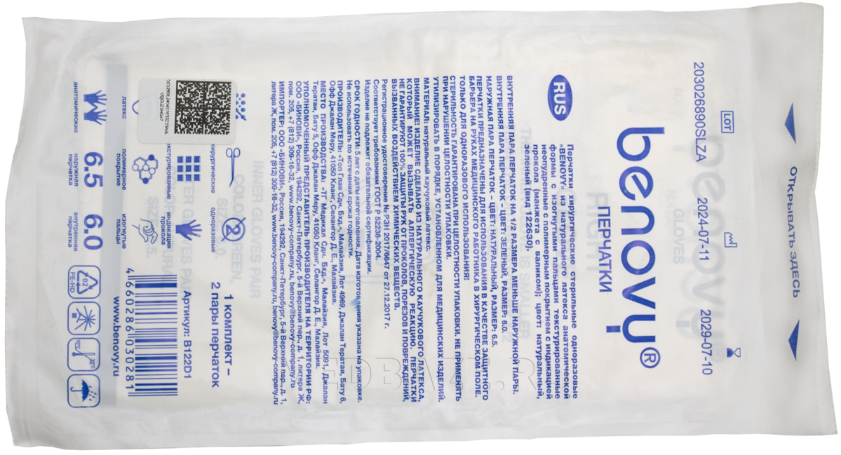 Описание: Перчатки хирургические с системой индикаций прокола Benovy анатомическй формы, стерильные, одноразовые, неопудренные изготовлены из высококачественного натурального каучукового латекса.