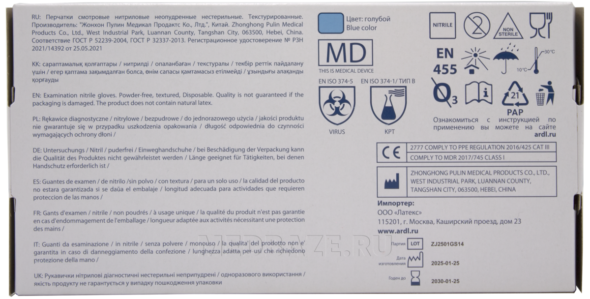 Описание: Перчатки смотровые нитриловые, нестерильные, без разделения на правую и левую руку. Текстурированная рабочая поверхность обеспечивает особо надежный захват инструмента в руке. Перчатки не лишены тактильной чувствительности, не меняют своих свойств в сухой и влажной среде, изготавливаются из синтетического материала без добавления латекса и пудры. Данное решение исключило возможность развития аллергических реакций. Предназначены для: защиты рук при проведении медицинских, диагностических, производственных, лабораторных процедур.