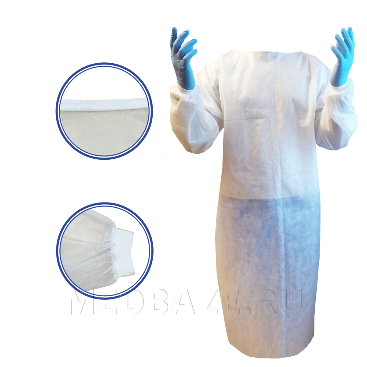 Описание: Халат одноразовый медицинский нестерильный, изготовлен из нетканого материала белого цвета, плотностью 25 г/м2. Ткань обладает водоотталкивающей функцией, хорошей воздухопроницаемостью и прочностью. Изделие 52-54 размера длиной 140 см, имеет длинный рукав на манжете и ворот обработаный бейкой.
