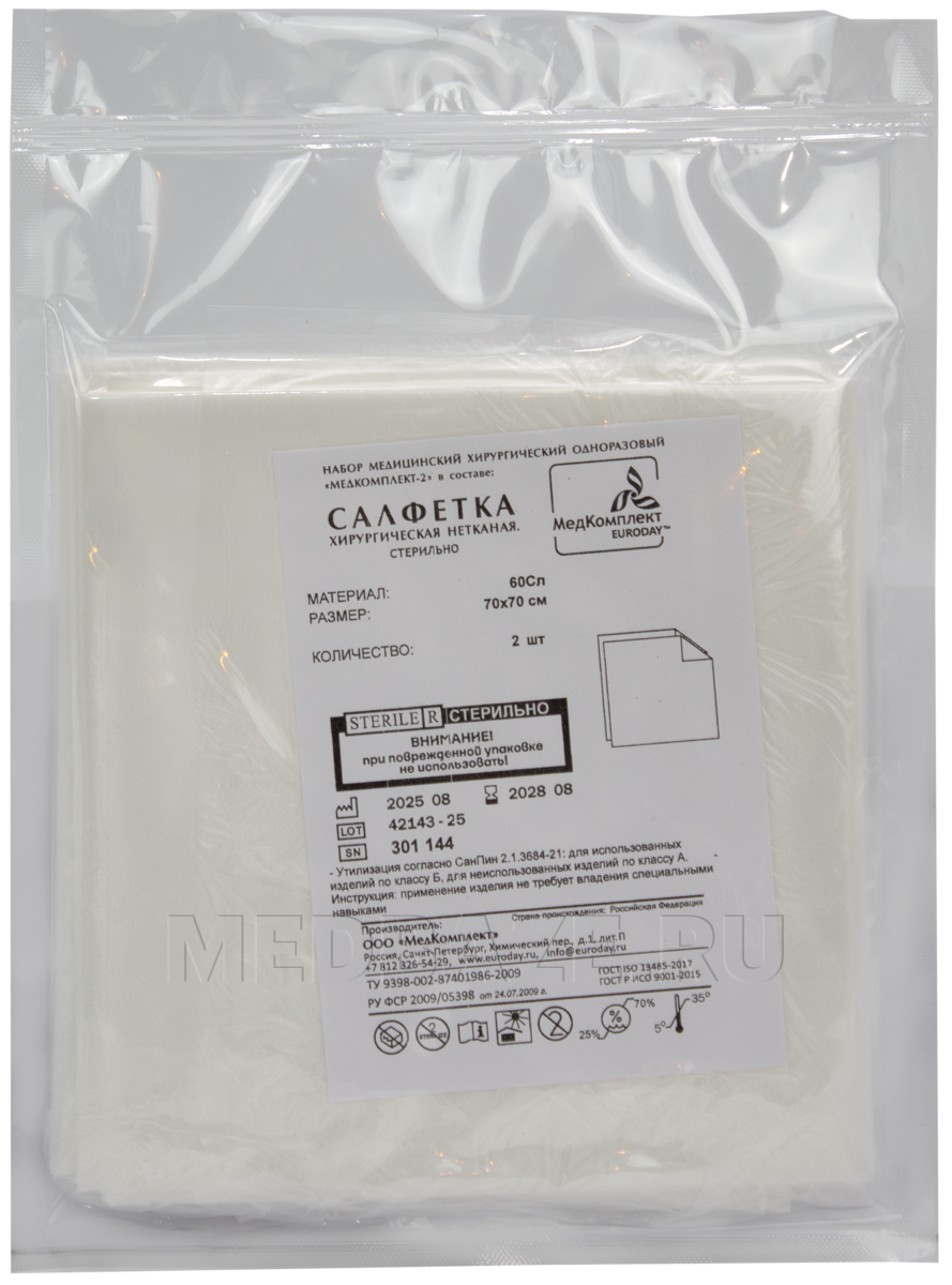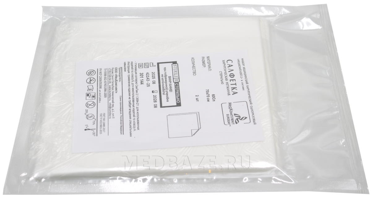 Описание: Салфетка одноразовая стерильная, размерами 70*70 см, изготовлена из нетканого материала фибрелла плотностью 60 г/м2. Материал обеспечивает хорошую впитываемость, не оставляет ворса, сохраняет прочность во влажном состоянии.