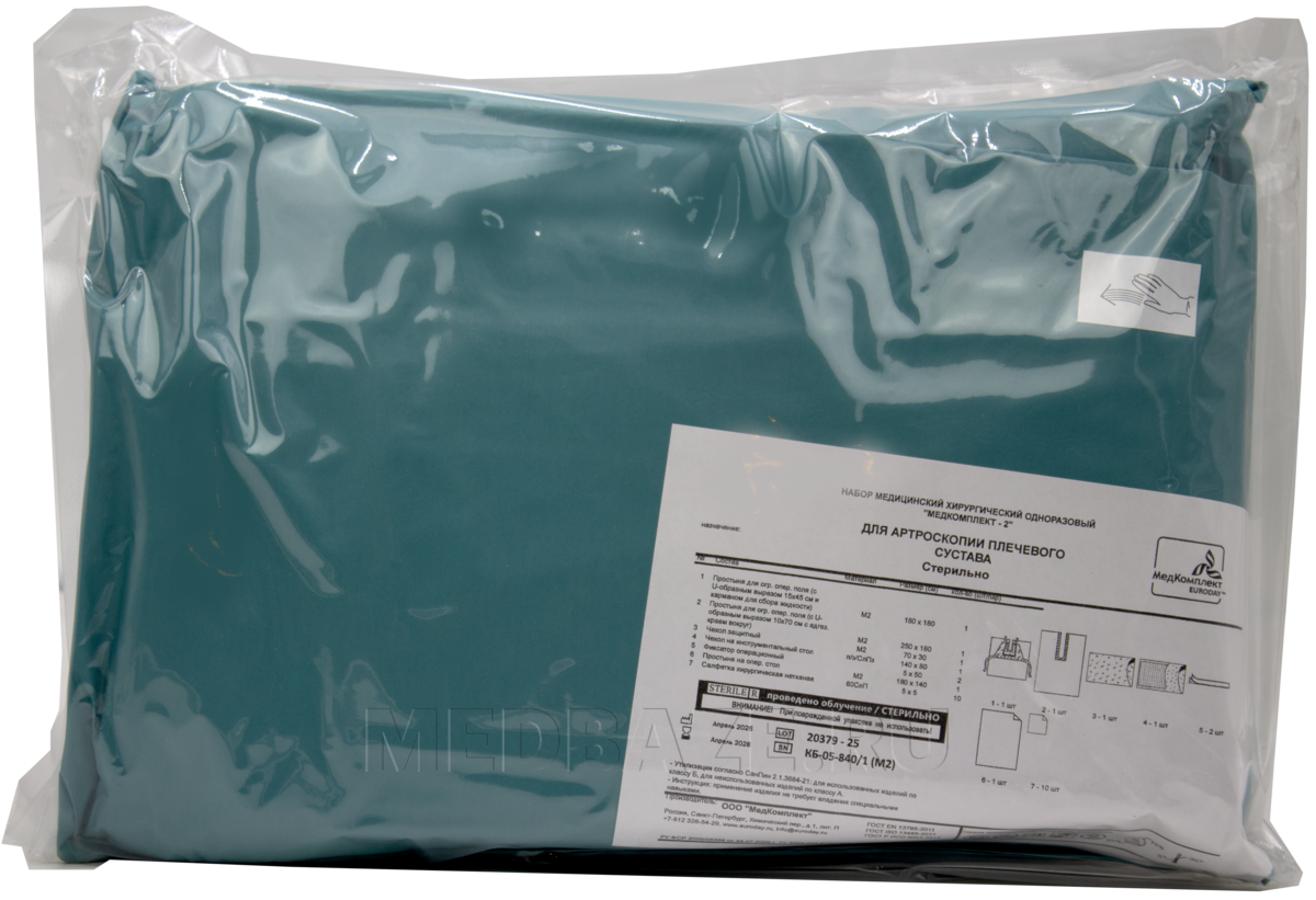 Описание: Комплект стерильного белья для артроскопии плечевого сустава изготовлен из нетканого материала М2. Набор белья состоит из: простыни для артроскопии; впитывающих салфеткок; клейкой ленты; чехла на руку; покрытия для больного с эластичным отверстием и мешком с портом; чехла на инструментальный стол.