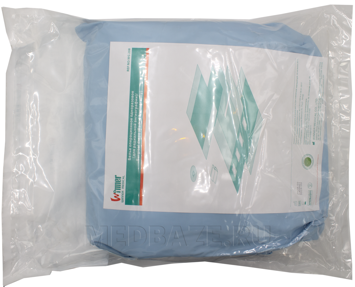 Описание: Комплект операционного белья включает простыню для радиальной ангиографии, размером 240*330 см, имеющую в центральной части двухслойный участок размерами 100*225 см и зоной повышенного впитывания 110*240 см. Простыня имеет 2 отверстия для радиального доступа 5*7 см и 2 отверстия для бедренного доступа 7*9 см с адгезионными краями. Кроме того, в комплект входят: простыни для операционного стола, двухслойные, 150*150 см, с зоной усиления 75*150 см (2 шт.); простыня с клейким краем, трехслойная, 50*50 см; впитывающая прокладка из 100% нетканого хлопка 43*68.5 см; полотенца из целлюлозы 30*40 см (2 шт.); чехол на рентгенографический тубус 160 см.