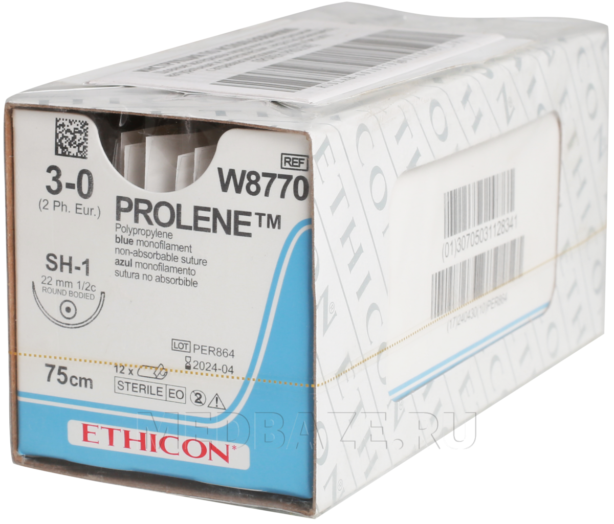 Нить синего цвета, толщина нити 3-0 USP (метрик 2), длина 75 см, с колющей иглой SH-1 1/2 круга, длиной иглы 22 мм.