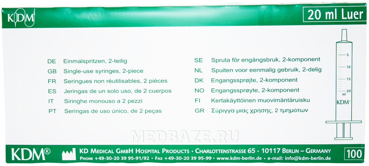 Шприц инъекционный 2-х комп. одноразовый 20 мл 21G 0.80*40 мм, с иглой (820223R), KD-Ject, 100 шт/уп