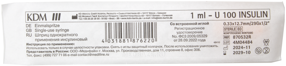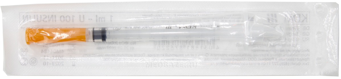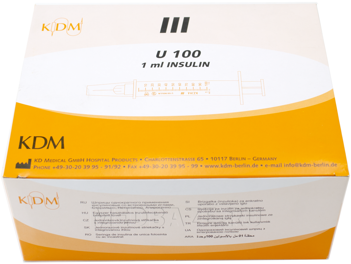 Описание: Шприц KD-Ject инъекционный 3-х компонентный, одноразовый, инсулиновый, стерильный, объемом 1 мл, имеет интегрированную (несъемную) иглу 0.33*12.7 мм. Цилиндр и поршень шприца изготовлены из высококачественного полипропилена. Уплотнительная манжета с двумя кольцами обеспечивает плавное движение поршня. Шприц оснащен стопорным кольцом, предотвращающим случайное извлечение поршня из цилиндра. Точная контрастная черная градуировка U100 и прозрачный цилиндр позволяют контролировать процесс введения лекарства. Каждый шприц упакован в индивидуальный блистер.