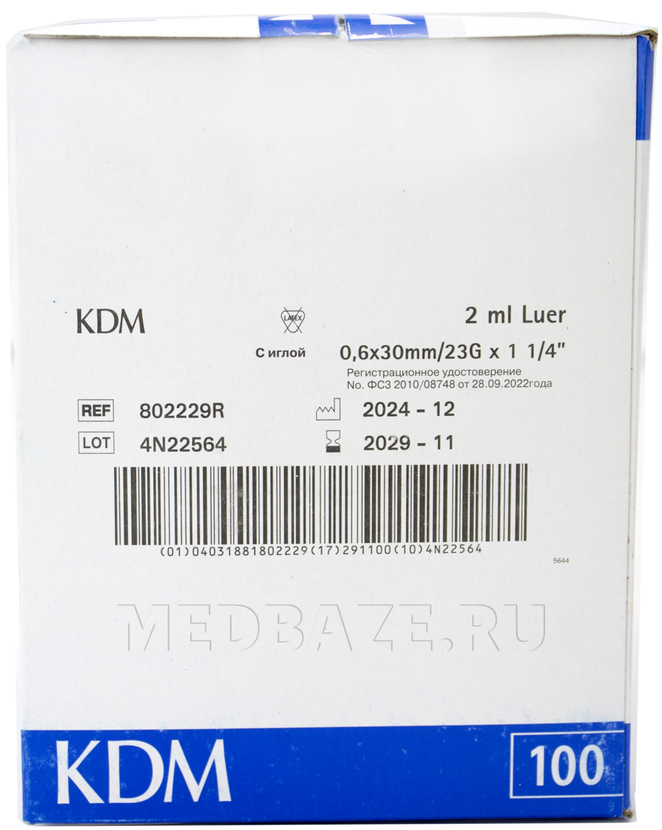 Шприц инъекционный 2-х комп. одноразовый KD-Ject 2 мл 23G 0.60*30 мм, с иглой (802229R), 100 шт/уп