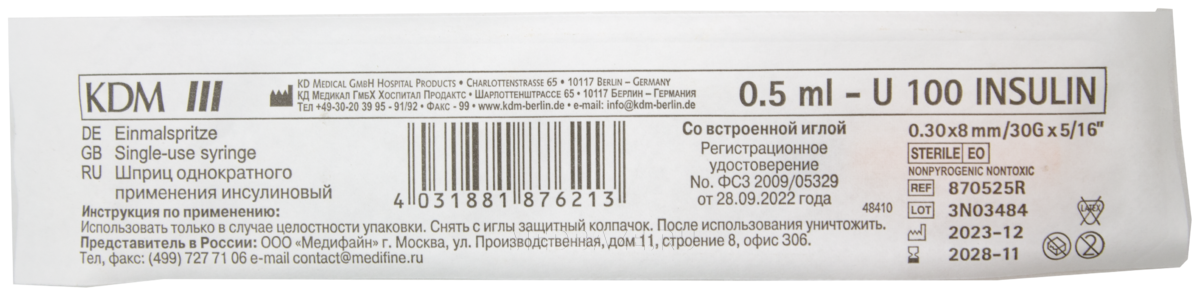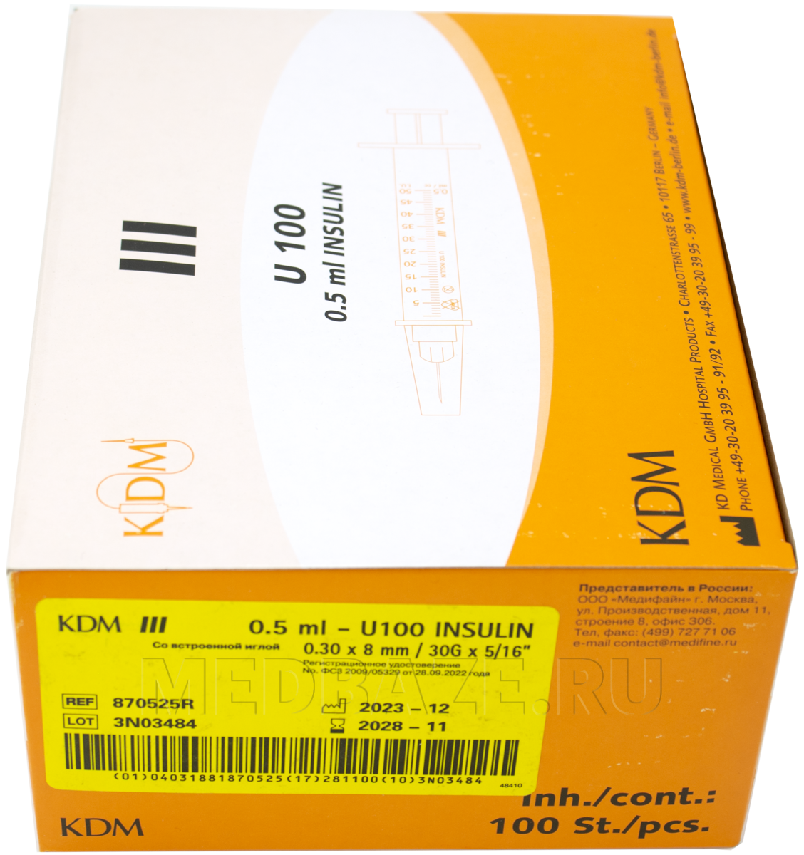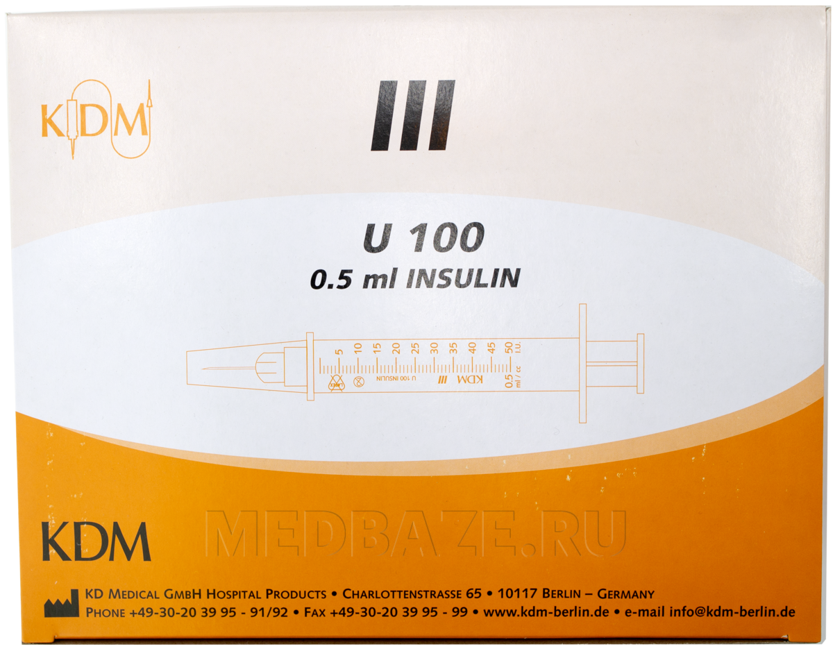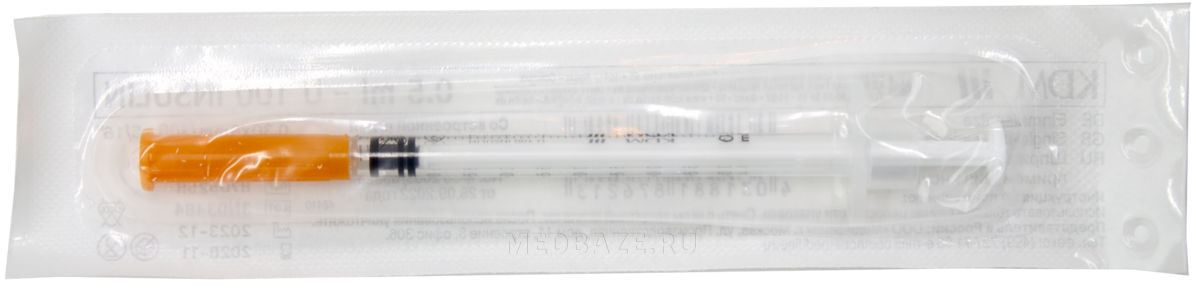 Описание: Шприц KDМ инъекционный 3-х компонентный, одноразовый, инсулиновый, стерильный, объемом 0.5 мл, имеет интегрированную (несъемную) иглу 30G (0.30*8 мм) с тройной степенью заточки и силиконовым защитным покрытием. Цилиндр и поршень шприца изготовлены из высококачественного полипропилена. Уплотнительная манжета с двумя кольцами обеспечивает плавное движение поршня. Шприц оснащен стопорным кольцом, предотвращающим случайное извлечение поршня из цилиндра. Точная контрастная черная градуировка U100 и прозрачный цилиндр позволяют контролировать процесс введения лекарства. Каждый шприц упакован в индивидуальный блистер.