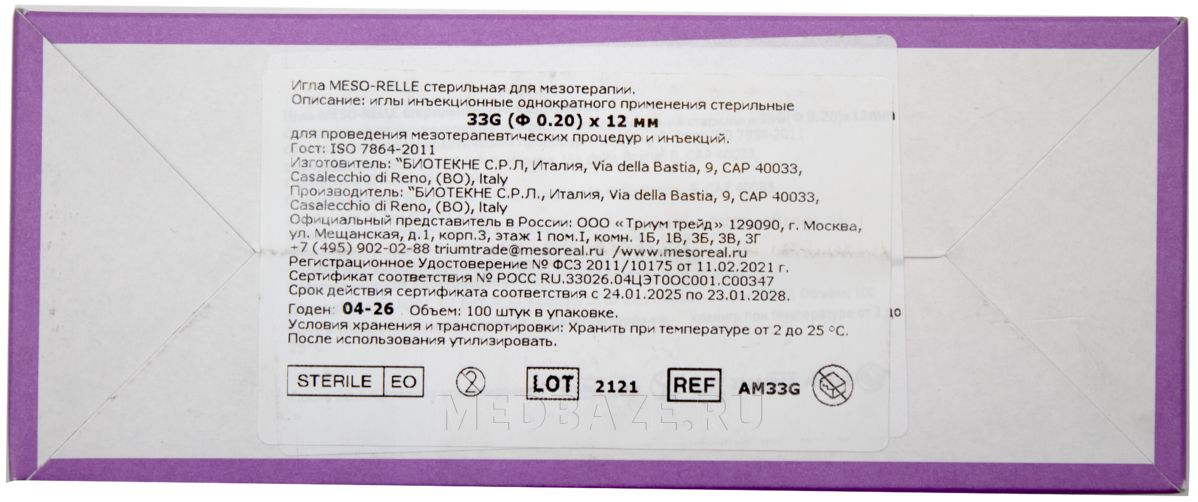 Описание: Игла для мезотерапии Meso-Relle инъекционная стерильная, одноразовая, с алмазной заточкой (игла Лабеля), с креплением луер-слип (обычное) и луер-лок (винтовое). Обеспечивает безболезненное введение препарата.