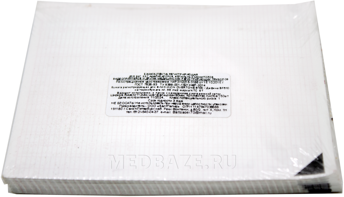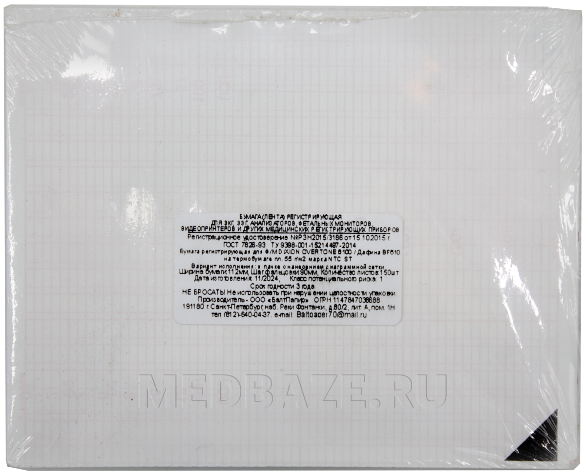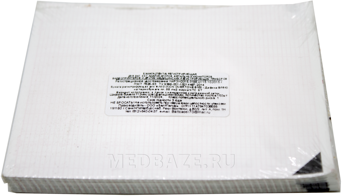 Описание: Мелованная бумага Z-сложения в пачках, покрытая термическим составом, реагирующим на нагревание. Количество листов в пачке - 150, листы разделены поперечной перфорацией. Ширина листа 112 мм, расстояние между складками (длина пачки) - 90 мм. Цвет сетки - розовый (шкала ЧСС 30 – 240 уд./мин). На каждом листе со стороны, обратной термослою, нанесена метка в виде черного треугольника.
