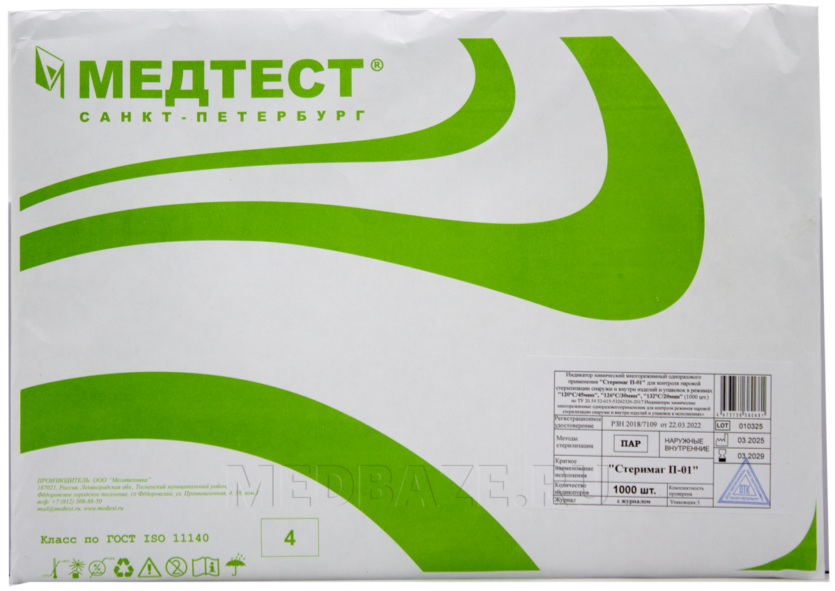 Описание: Индикатор химический СтериМаг-П-01 120°С/45 мин, 126°С/30 мин, 132°С/20 мин, соответствующий классу 4 (многопеременные индикаторы) по ГОСТ ISO 11140-1-2011, в виде бумажного носителя на клеевом основании с защитной подложкой, на лицевой поверхности которого нанесены маркировка, метка сравнения и индикаторная метка.