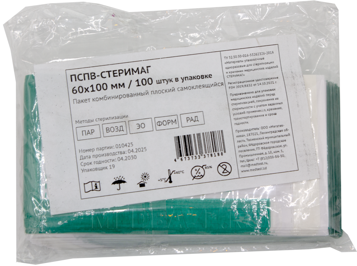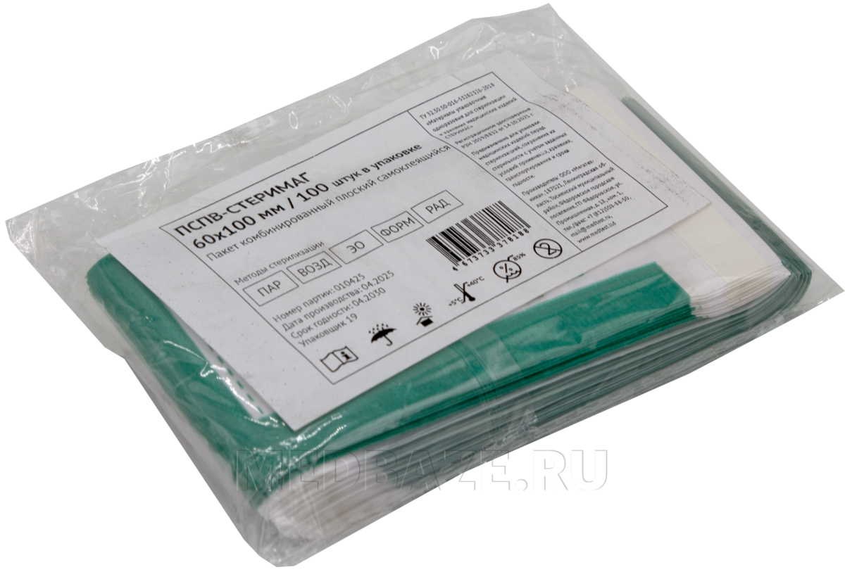 Описание: Комбинированный одноразовый стерилизационный пакет, предназначенный для упаковывания и хранения изделий медицинского назначения перед и после стерилизации, представляет собой комбинированную упаковку, состоящую из специальной водоотталкивающей медицинской бумаги с одной стороны и из прочной пленки с другой, соединенных между собой клеевым швом. Прозрачная пластиковая часть позволяет видеть содержимое пакета. На пакеты нанесены цветные химические индикаторы-свидетели процесса 1 класса для определения выдержки в том или ином цикле стерилизации.