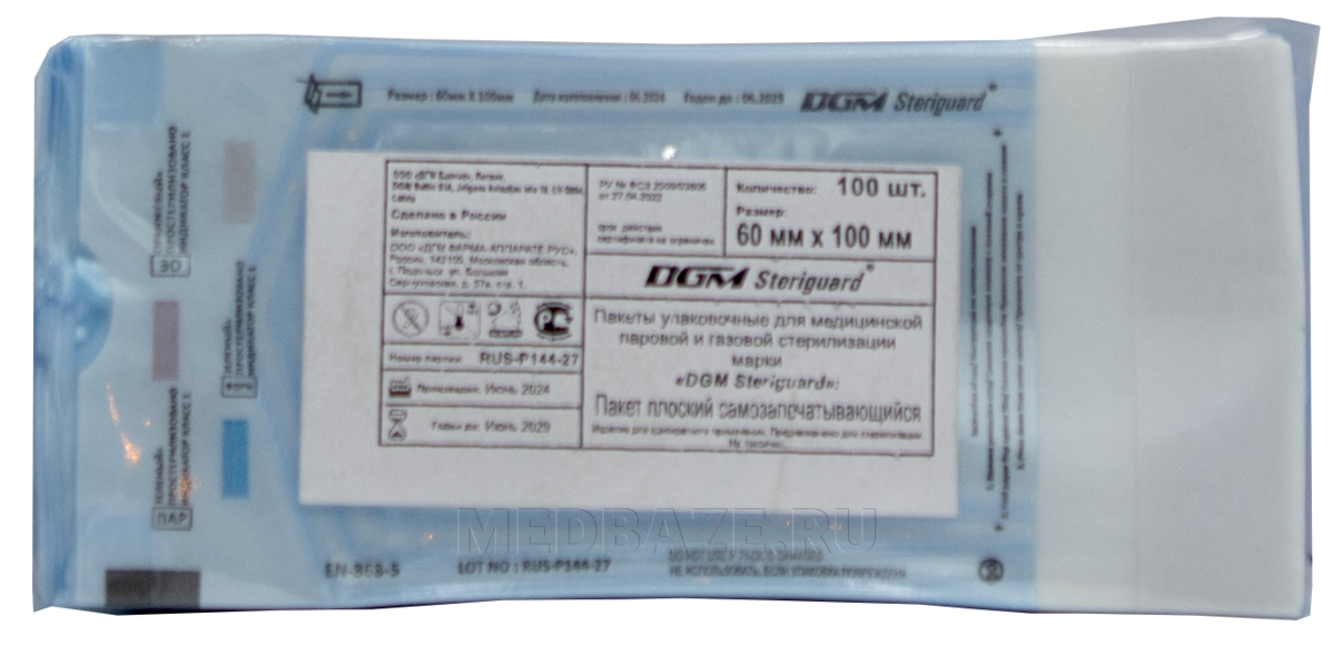 Описание: Одноразовый стерилизационный пакет, предназначенный для упаковывания и хранения изделий медицинского назначения, представляет собой комбинированную упаковку, состоящую из нервущейся безосколочной многослойной пленки-ламината (комбинация полиэстера и полипропилена) и медицинской бумаги. На пакете нанесены химические индикаторы 1 класса, позволяющие отличить простерилизованные изделия от изделий, не подвергнутых стерилизационной обработке.