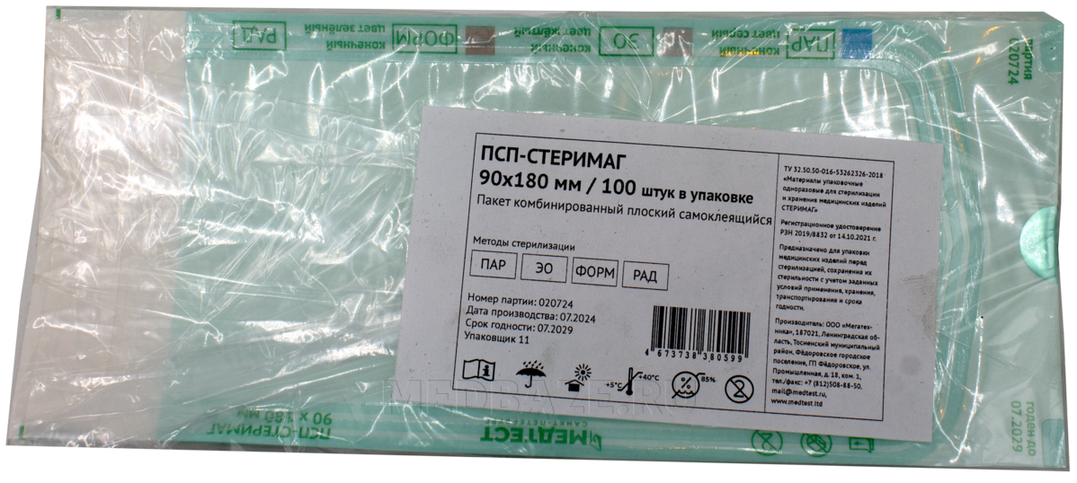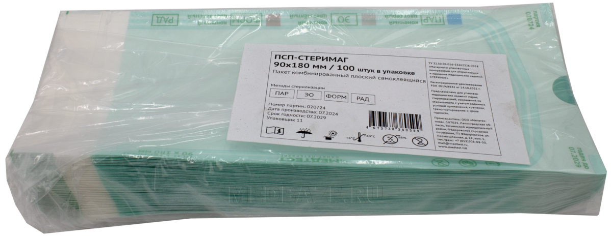 Описание: Комбинированный одноразовый стерилизационный пакет, предназначенный для упаковывания и хранения изделий медицинского назначения перед и после стерилизации, представляет собой комбинированную упаковку, состоящую из специальной водоотталкивающей медицинской бумаги с одной стороны и из прочной пленки с другой, соединенных между собой клеевым швом. Прозрачная пластиковая часть позволяет видеть содержимое пакета. На пакеты нанесены цветные химические индикаторы-свидетели процесса 1 класса для определения выдержки в том или ином цикле стерилизации.