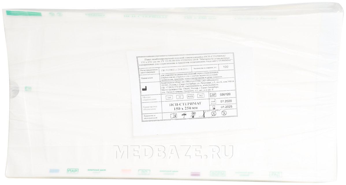 Описание: Комбинированный одноразовый стерилизационный пакет, предназначенный для упаковывания и хранения изделий медицинского назначения перед и после стерилизации, представляет собой комбинированную упаковку, состоящую из специальной водоотталкивающей медицинской бумаги с одной стороны и из прочной пленки с другой, соединенных между собой клеевым швом. Прозрачная пластиковая часть позволяет видеть содержимое пакета. На пакеты нанесены цветные химические индикаторы-свидетели процесса 1 класса для определения выдержки в том или ином цикле стерилизации.