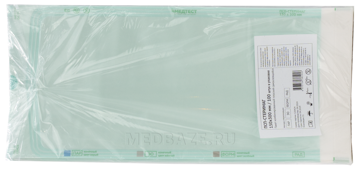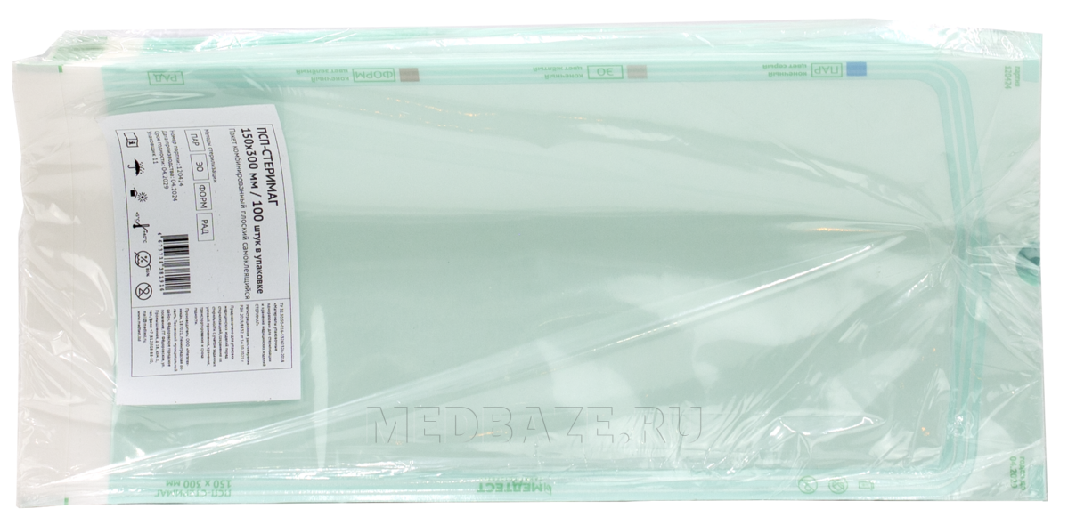 Описание: Комбинированный одноразовый стерилизационный пакет, предназначенный для упаковывания и хранения изделий медицинского назначения перед и после стерилизации, представляет собой комбинированную упаковку, состоящую из специальной водоотталкивающей медицинской бумаги с одной стороны и из прочной пленки с другой, соединенных между собой клеевым швом. Прозрачная пластиковая часть позволяет видеть содержимое пакета. На пакеты нанесены цветные химические индикаторы-свидетели процесса 1 класса для определения выдержки в том или ином цикле стерилизации.