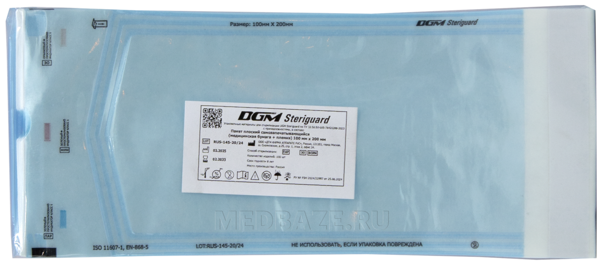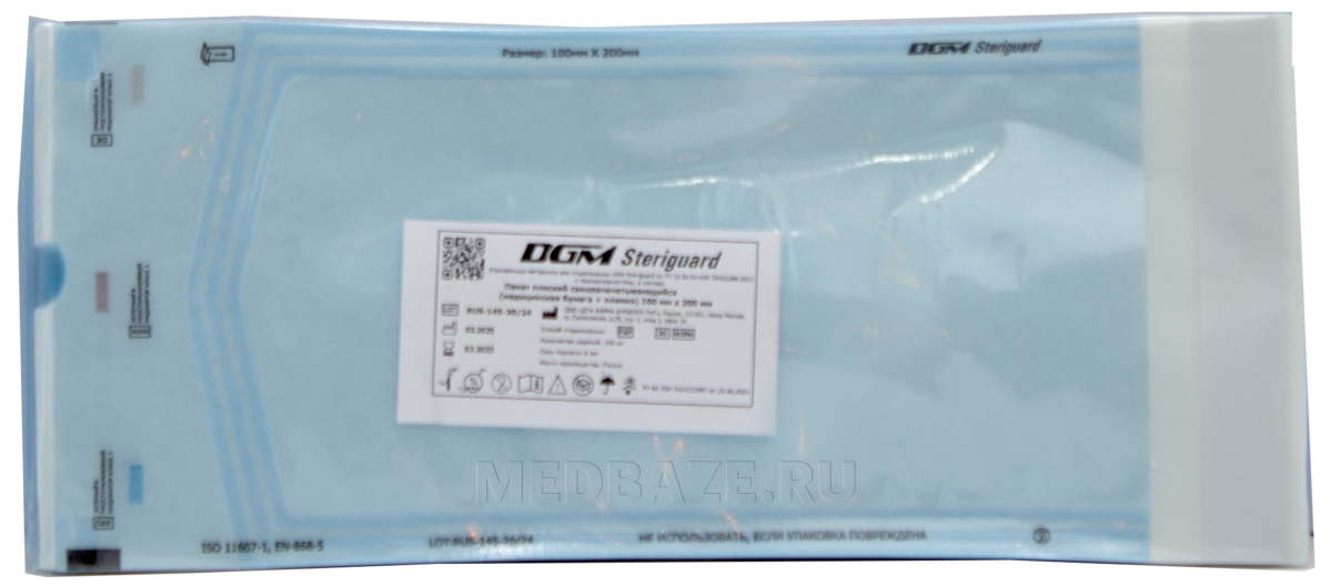 Описание: Одноразовый стерилизационный пакет, предназначенный для упаковывания и хранения изделий медицинского назначения, представляет собой комбинированную упаковку, состоящую из нервущейся безосколочной многослойной пленки-ламината (комбинация полиэстера и полипропилена) и медицинской бумаги. На пакете нанесены химические индикаторы 1 класса, позволяющие отличить простерилизованные изделия от изделий, не подвергнутых стерилизационной обработке.