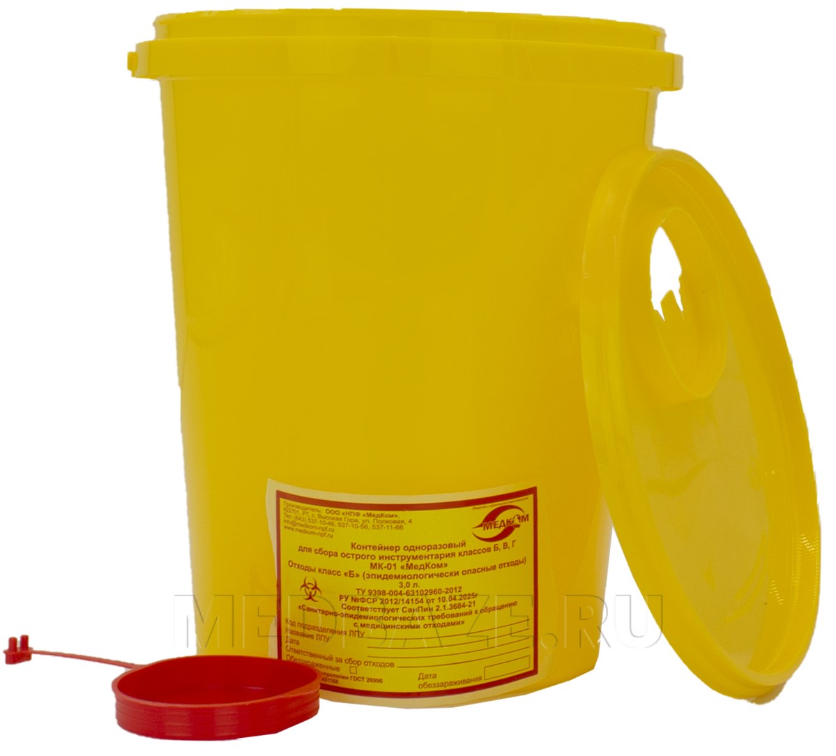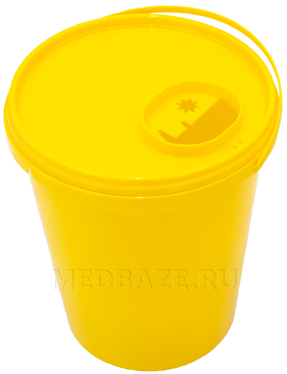 Описание: Контейнер для сбора острого инструментария класса Б одноразовый нестерильный, изготовлен из полипропилена желтого цвета. Емкость объемом 3.0 литра оснащена двойной крышкой с заглушкой, обеспечивающей герметичное ее закрытие в двух положениях «временно» и «окончательно» закрыто, имеет наклейку для маркировки, устройство для бесконтактного снятия игл и гибкую удобную ручку длиной 28 см для переноски. Заглушка размерами 5.5*6.5 см, закреплена на основной крышке во избежание ее потери.
