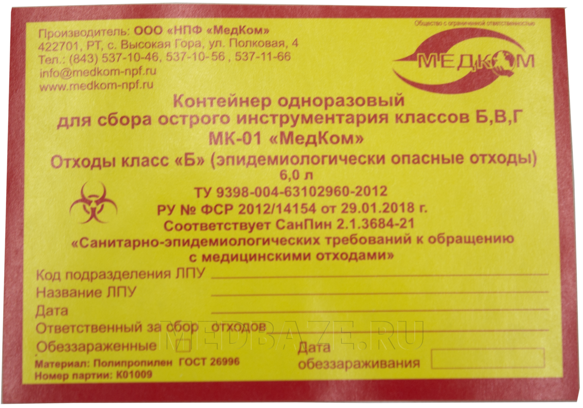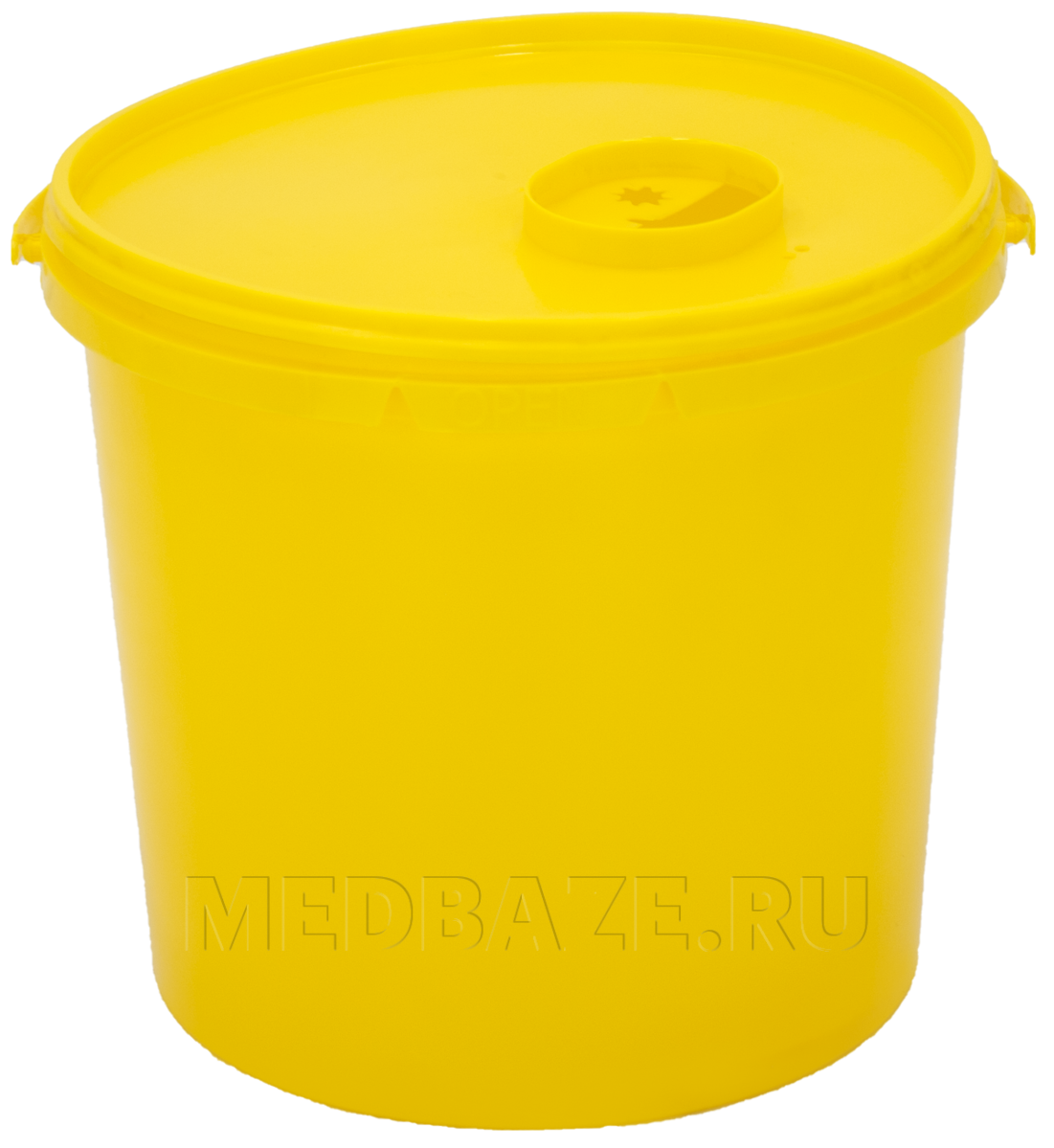 Описание: Контейнер для сбора острого инструментария класса Б одноразовый нестерильный, изготовлен из полипропилена желтого цвета. Емкость объемом 6.0 литров оснащена двойной крышкой с заглушкой, обеспечивающей герметичное ее закрытие в двух положениях «временно» и «окончательно» закрыто, имеет наклейку для маркировки, устройство для бесконтактного снятия игл и гибкую удобную ручку длиной 42.5 см для переноски. Заглушка размерами 5.5*6.5 см, закреплена на основной крышке во избежание ее потери.