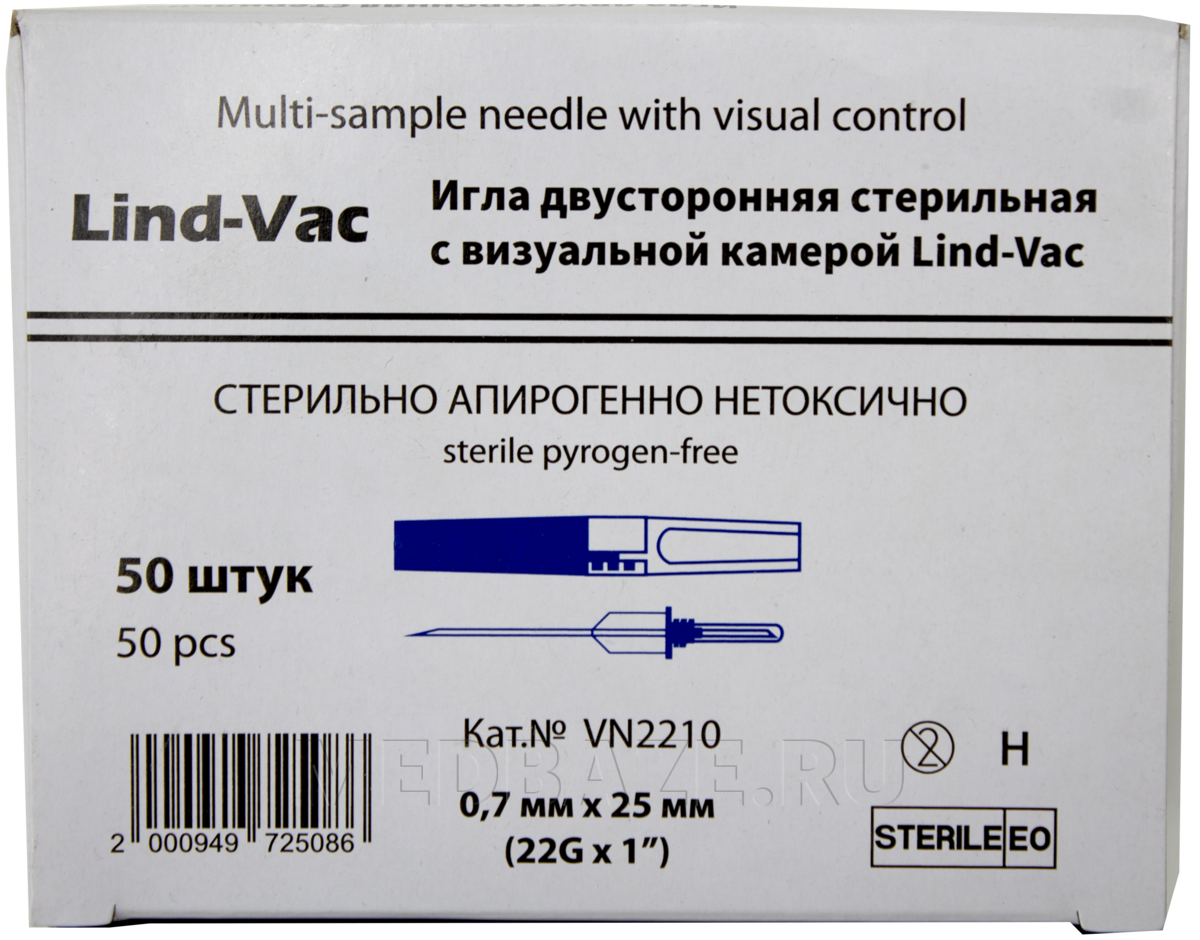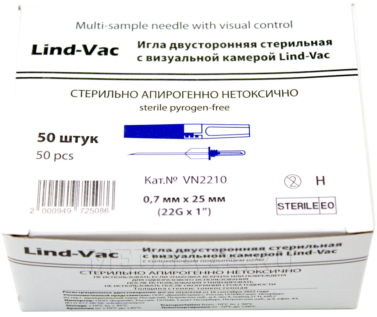 Игла двусторонняя с прозрачной камерой 22G 0.7*25 мм, (VN2210), Lind-Vac, 50 шт/уп