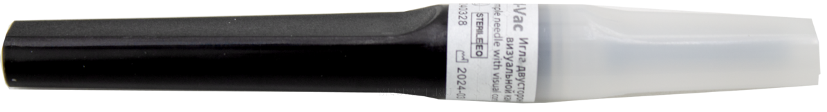 Описание: Медицинское изделие однократного применения, стерильное - двусторонняя игла с прозрачной камерой для визуализации тока крови, используется совместно с вакуумными пробирками и с многоразовыми и одноразовыми иглодержателями. Игла с длинным скосом иглы 11°±2°, с обоих концов снабжена пластиковыми футлярами, скрепленными этикеткой с перфорацией, предотвращающей повторное использование. Имеет силиконизированное покрытие снаружи и изнутри, резьбу для ввинчивания иглы в иглодержатель. Одна часть иглы предназначена для введения в вену пациента, другая, закрытая резиновым кожухом, для того, чтобы проколоть резиновую часть пробки пробирки. Цветовая кодировка в соответствии с ISO 6009.