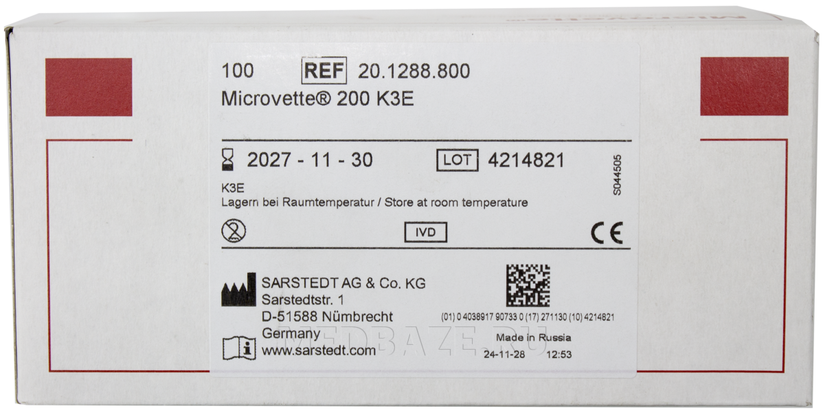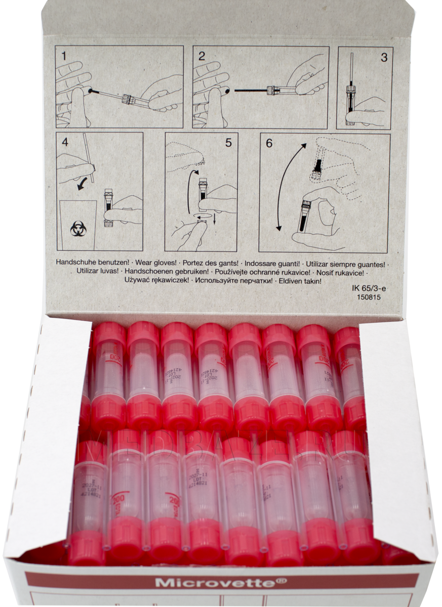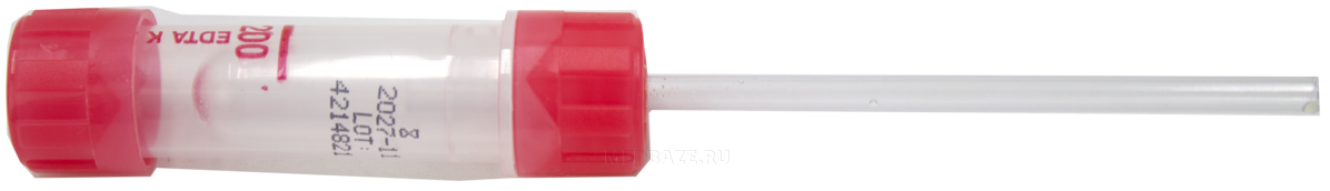 Описание: Стерильные одноразовые мини-пробирки с интегрированным капилляром для взятие цельной капиллярной крови. Пробирка двойная: внутри основной пробирки расположена круглодонная микропробирка для капиллярной крови. Пробирка имеет две резьбовые крышки. На внутренние стенки круглодонной пробирки и коллектора напылен антикоагулянт К3 ЭДТА, что позволяет крови не сворачиваться при взятии образца для гематологических исследований. На пробирке имеется этикетка с указанием стерильности, объема пробирки, состава наполнителя, срока годности, номера лота, точной отметки уровня наполнения.