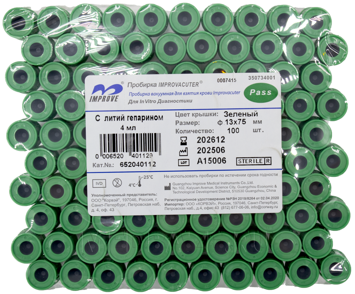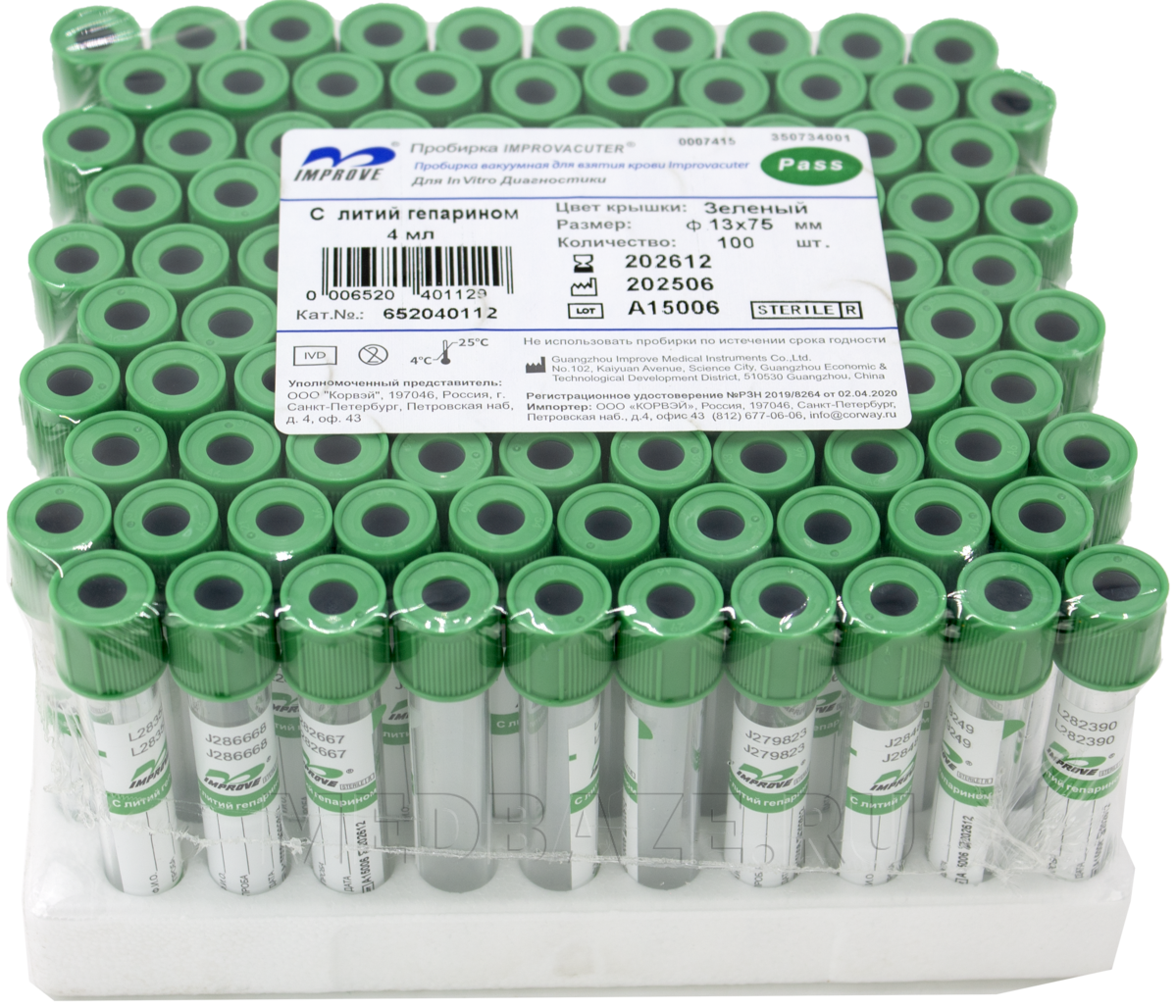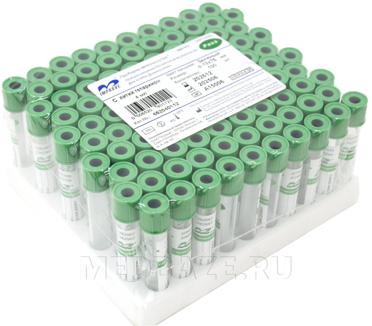 Описание: Пробирки вакуумные с литий гепарином (код на этикетке LH) в виде сухого мелкодисперсного напыления на внутренней стенке для равномерного взаимодействия с забираемой венозной кровью и получения гепаринизированной плазмы. Изготовлены из химически чистого пластика и промаркированы согласно стандарту ИСО.