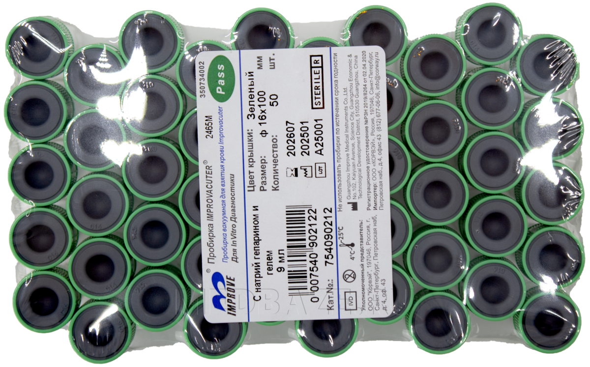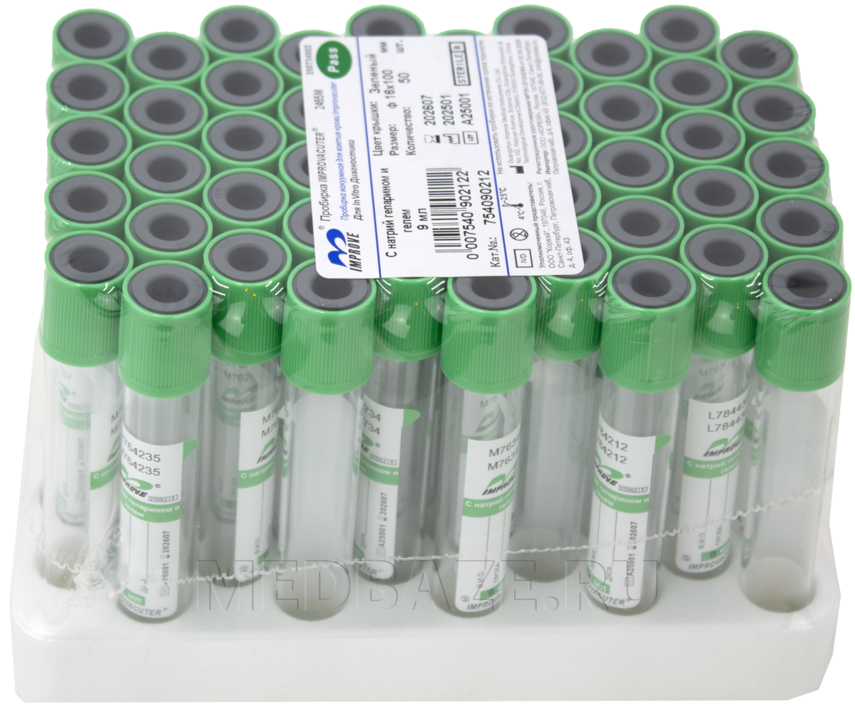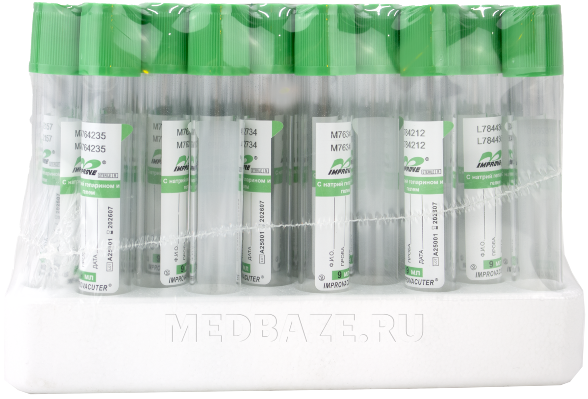 Описание: Пробирки вакуумные с натрий гепарином в виде сухого мелкодисперсного напыления на внутренней стенке. Разделительный гель после центрифугирования образует барьер между плазмой и форменными элементами крови. Изготовлены из химически чистого пластика и промаркированы согласно стандарту ИСО.