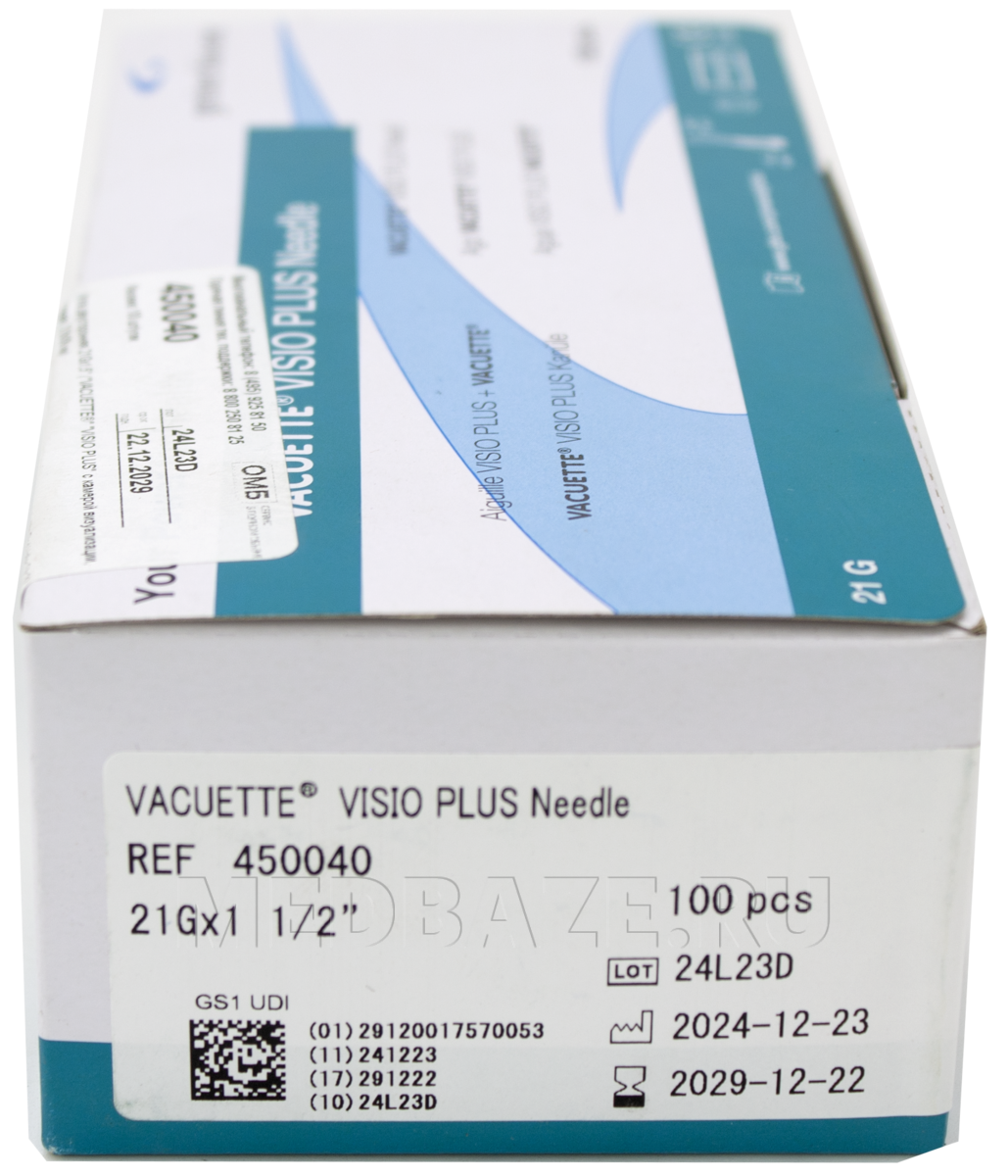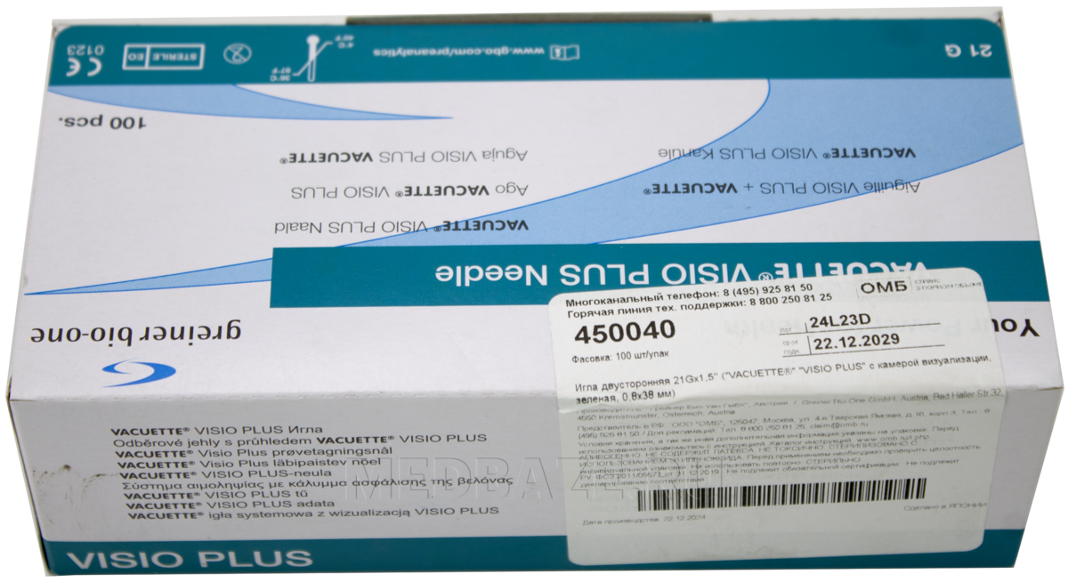 Описание: Медицинское изделие однократного применения, стерильное - двусторонняя игла с прозрачной камерой для визуализации тока крови, используется совместно с вакуумными пробирками и с многоразовыми и одноразовыми иглодержателями. Игла с двойным косоугольным срезом, с обоих концов снабжена пластиковыми футлярами, скрепленными этикеткой с перфорацией, предотвращающей повторное использование. Имеет силиконизированное покрытие снаружи и изнутри, резьбу для ввинчивания иглы в иглодержатель. Одна часть иглы предназначена для введения в вену пациента, другая, закрытая резиновым кожухом, для того, чтобы проколоть резиновую часть пробки пробирки. На конце иглы, направляемом в пробирку, имеется гибкий клапан из каучука, предотвращающий вытекание крови из иглы при смене пробирок. Цветовая кодировка в соответствии с ISO 6009.