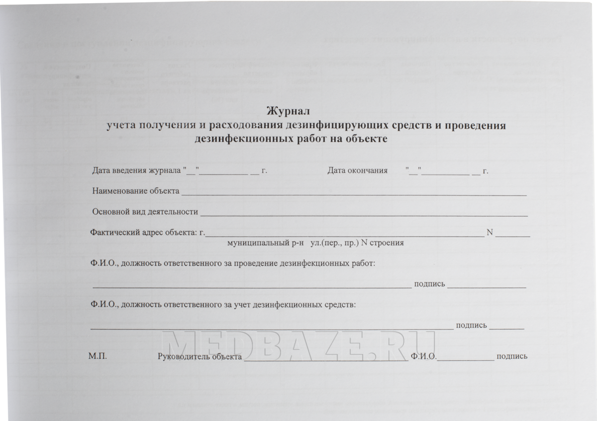 Описание: Журнал имеет размеры 210*290 мм, обложку из картона плотностью 160 г/м2 и внутренний блок объемом 30 листов. В журнал вносится информация об имеющемся на объекте необходимом запасе дезинфицирующих средств и наличии условий для проведения дезинфекционных мероприятий в профилактических целях. Предназначен для: Ведения учета получения и расходования дезинфицирующих средств