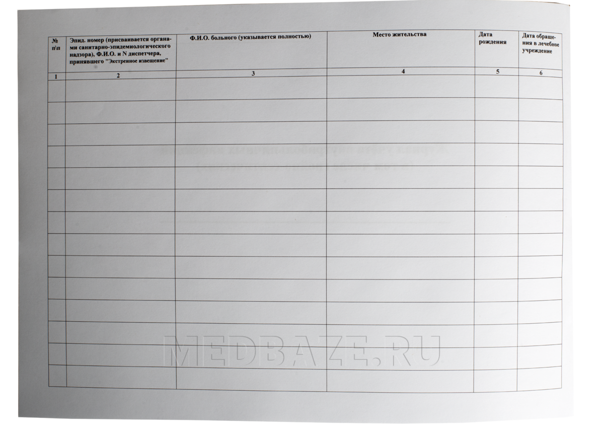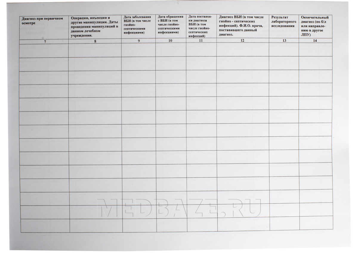 Описание: Журнал имеет обложку из тонкого картона плотностью 250 г/м2 и внутренний блок белой бумаги плотностью 80 г/м2 объемом 32 листа. Крепление блока осуществляется на скобах. Страницы журнала пронумерованы, имеются книжную ориентация, отверстия для шнуровки и архивации. В журнал заносятся данные учета случаев возникновения внутрибольничных инфекций
